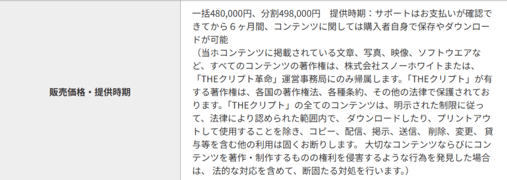 THEクリプトの参加費用は一括480,000円、分割498,000円